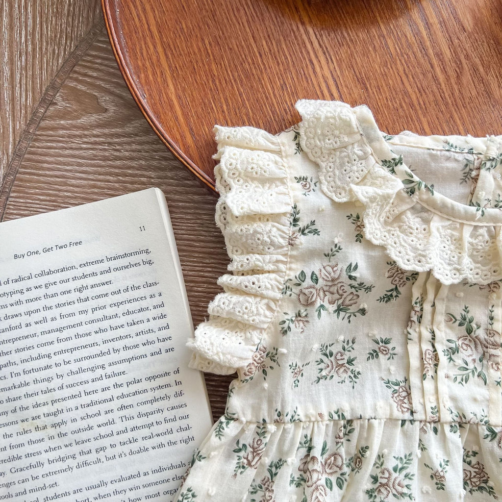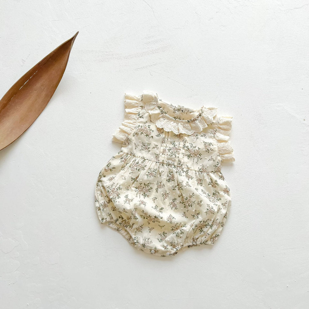 Floral sleeveless lace print onesie made with delicate ruffle design.