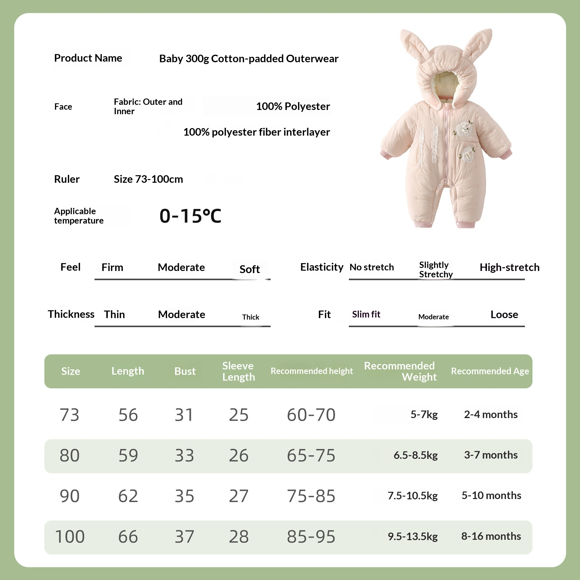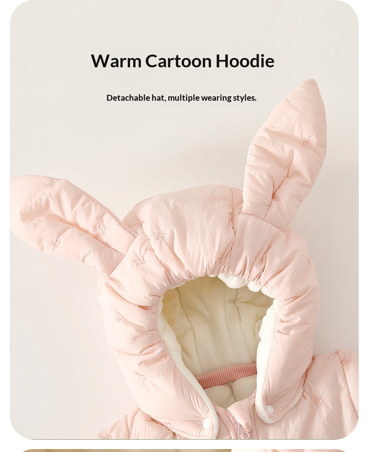 Product information: Colors: Flower & Little Rabbit, Floral Butterfly, Lucky Little Monkey, Gray Crocodile, Gray Puppy, Khaki Bow, Cartoon Crocodile, Pocket Fortune Little Rabbit, Instant Happiness, Year After Year with Fish, Peaceful & Joyful Bear, Left & Right Fortune Cat Suitable Heights: 73 cm, 80 cm, 90 cm, 100 cm Style: Long Romper Fabric Name: Polyester Fiber Closure Style: Zippered Jacket Hooded: Detachable Hood Sleeve Length: Long Sleeve Style: Casual