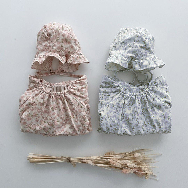 Comfortable floral graphic long sleeve cotton bodysuit for girls with matching cute hat for sunny days.